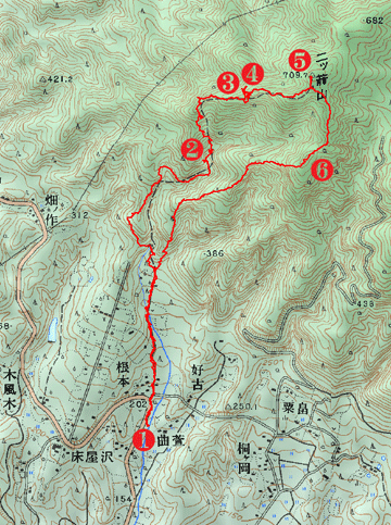 二ツ箭山の山頂は木立の中の狭い場所だ。展望もなく、あまり休むには適さない場所だ。休むのはやめて下山にかかることにした。